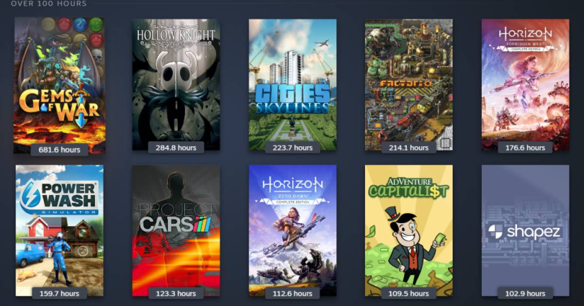 I like games from a bunch of different genres, but mostly metroidvanias, sokoban block-pushing puzzles, automation games, cleaning simulators, solitaire, and visual novels. I'll make a list of recommended games soon, so if you've got an RSS reader, please subscribe so you don't miss it! In the meantime, here's a snapshot of my most played games on Steam.